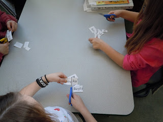 First Graders working in Guided Reading Groups. Mrs. Sam introduces them to cut up sentences!! ...